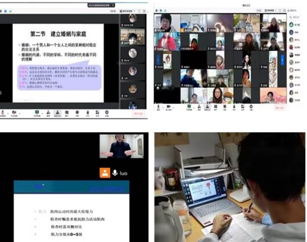 图1为陈晓莉教授讲授《人类发展学》,图2为张青老师进行《护理生涯规划》期未汇报,图3为罗先武老师在《健康评估》课上做示范,图4为2021级学生在寝室进行线上听课。