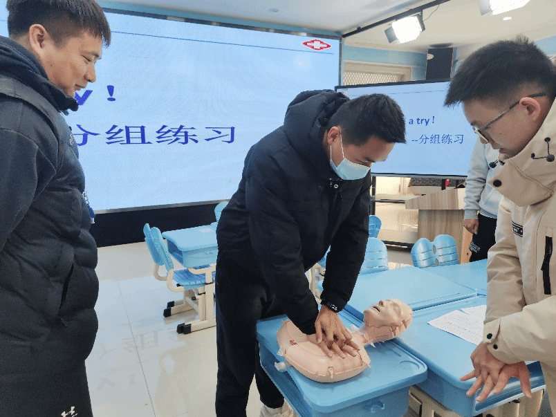 此次培训分为理论培训和实操演练两个环节。理论培训由刘鸿博同学结合PPT图片深入浅出地讲解了心肺复苏急救要领,徐康同学借助人体模型教具,进行了心肺复苏术的动作示范。老师们认真听课并积极互动,知道了心肺复苏中挽救生命关键的“黄金4分钟”。