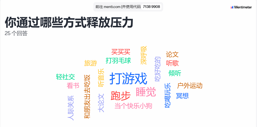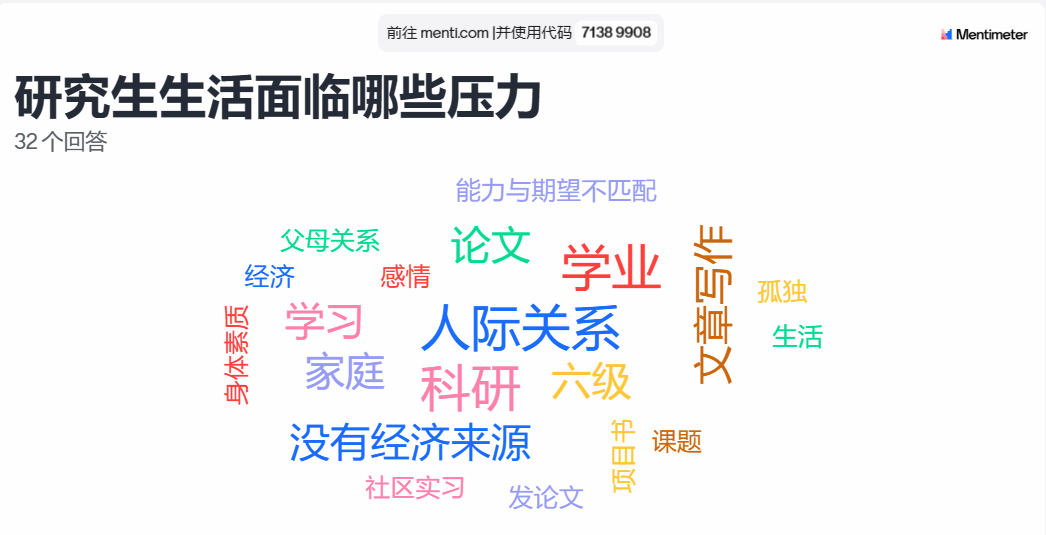 接着,心理委员邀请同学们使用mentimeter实时匿名探讨大家研究生生活所面临的压力及缓解压力的措施,同学们都非常积极地参与了讨论。