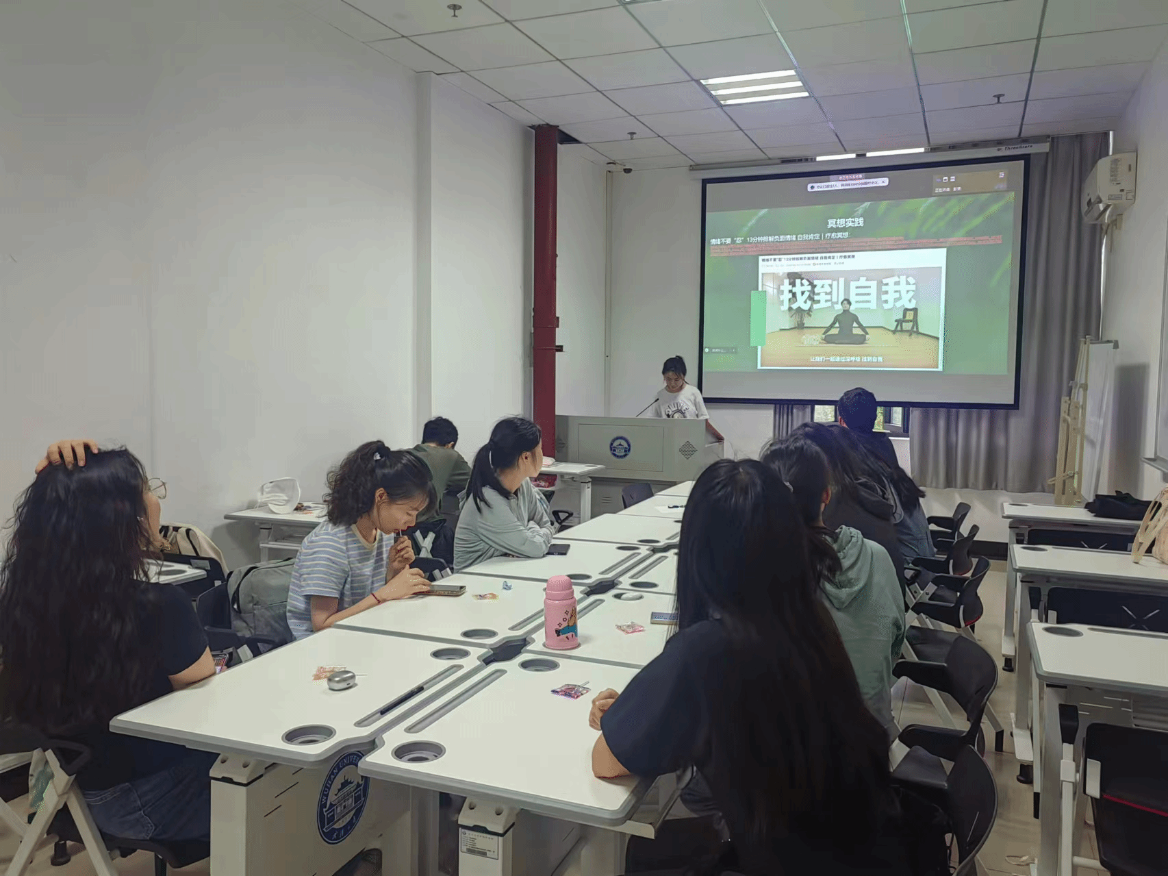 之后,心理委员通过B站视频《情绪不要“忍”13分钟排解负面情绪 自我肯定|疗愈冥想》带领同学们初步体验冥想。