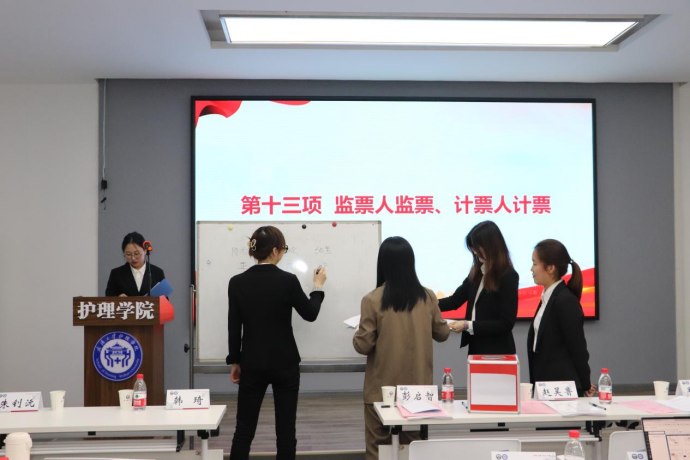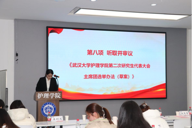 第二次研究生代表大会主席团选举办法(草案)》以及护理学院第二届研究生会主席团候选人名单和总监票人、监票人、计票人名单,均表决通过。