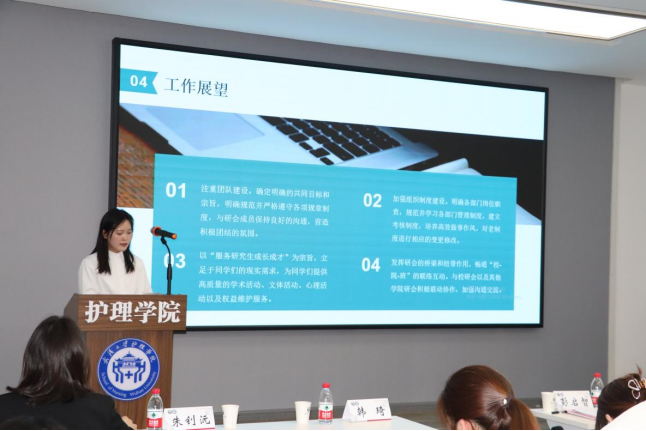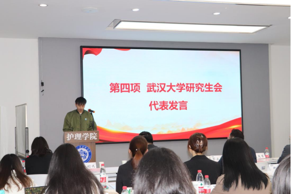 随后,研究生会代表朱钊沅同学发言。他表示护理学院研究生会团结带领广大研究生同学,围绕学院中心工作,立足学科特色,在服务、凝聚广大研究生同学方面,做出了大量卓有成效的工作,开展了一系列有创意、有内涵的活动。
