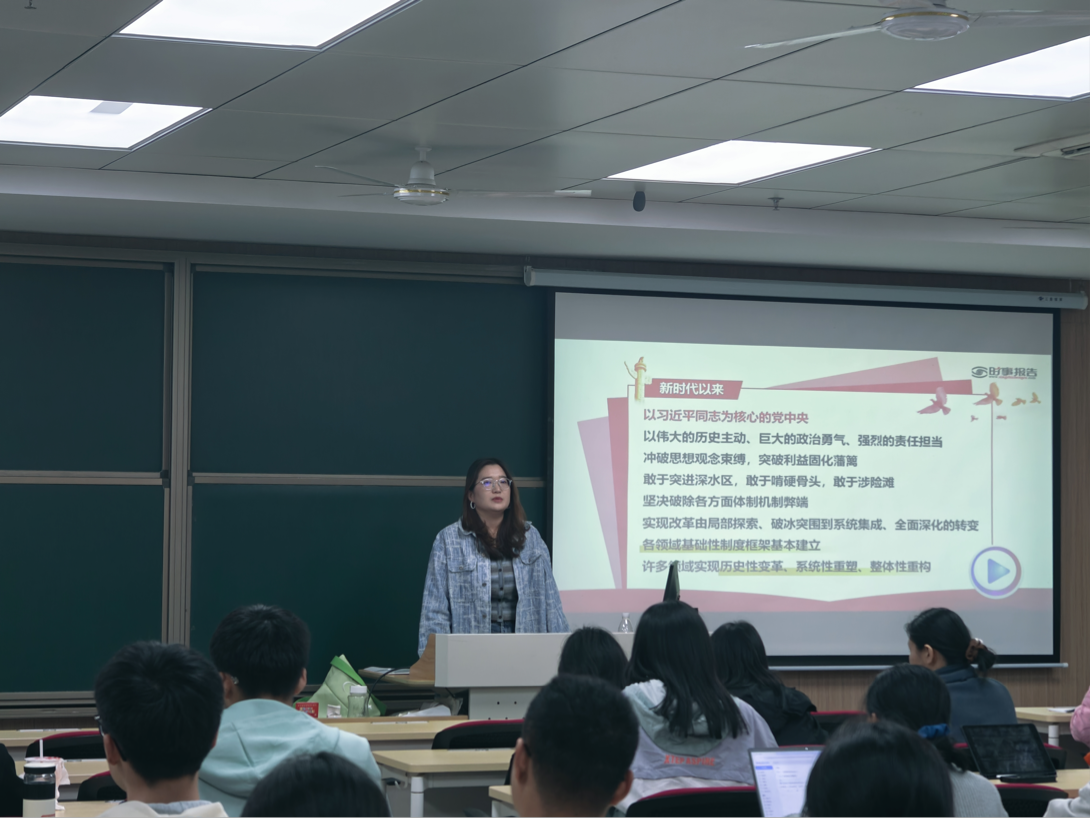 在锚定关键领域方面,她与同学们共同学习了《中共中央关于进一步全面深化改革、推进中国式现代化的决定》。从党的十八届三中全会到党的二十届三中全会,目标指向一脉相承,其中的十五条部署、各阶段目标,包括2035目标、2029目标等清晰呈现。《决定》中提出的七个聚焦、六个原则以及新质生产力等内容,为同学们勾勒出了改革的宏伟蓝图。