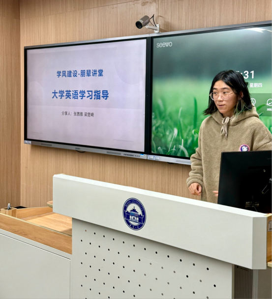 张茜雅,大学英语类课程均分90+;参加“外研社·国才杯”等英语竞赛累计获奖7项。她着重分享了“如何在大学学好英语”这一主题。从“如何提升英语学习兴趣”展开,她鼓励大家认识到英语学习的重要性,通过介绍好用的英语学习软件和校级英语学习平台与资源,帮助同学们激发英语学习兴趣,逐步实现英语学习目标。