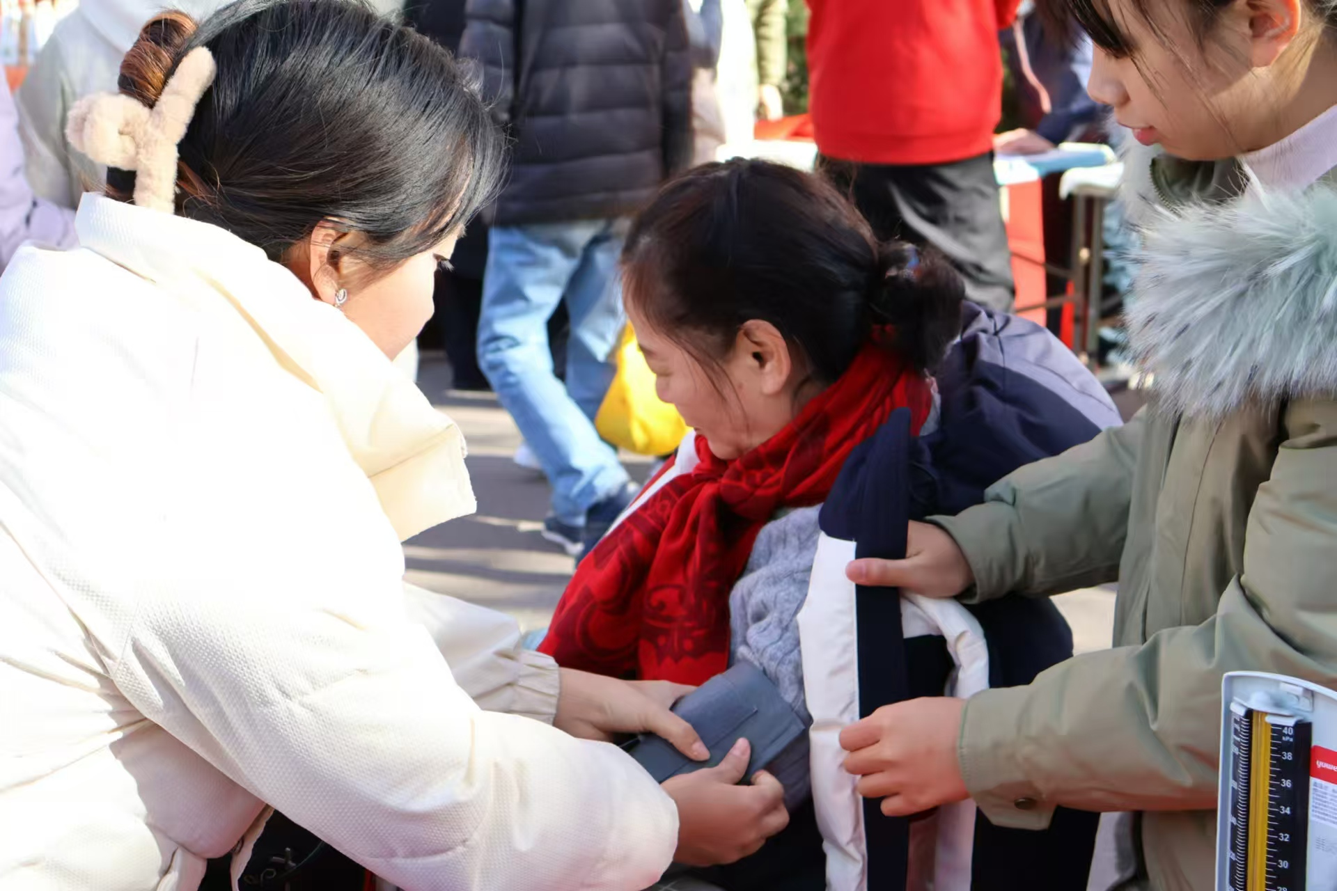 水生所社区内,同学们忙碌地摆放物资、搬桌椅、贴春联、挂灯笼,社区洋溢着蛇年新春喜庆。九点义诊开始,寒冷天气下,同学们注意为居民披外套、帮老人看管物品、搬凳子,体现护理人文关怀。同学还组织赠送大白菜活动,白菜寓意“百财”,送上对居民美好祝福。