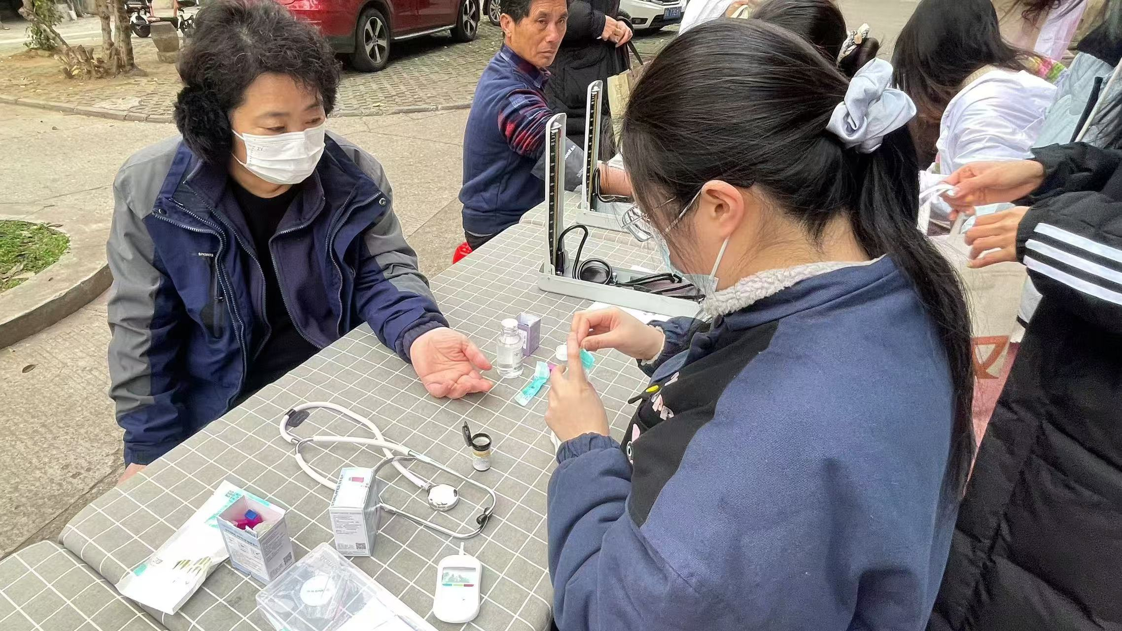 优秀学生代表聂梦缘同学开展实践技能培训,带领同学复习巩固测量血糖、血压等操作流程与注意事项,强调减轻疼痛的检测部位和减少居民不适感的正确操作。