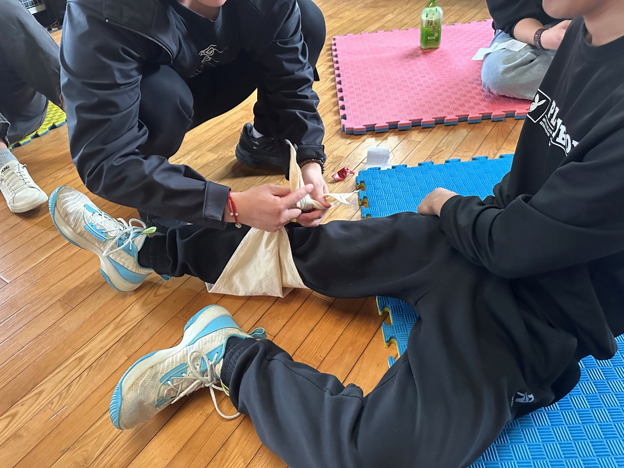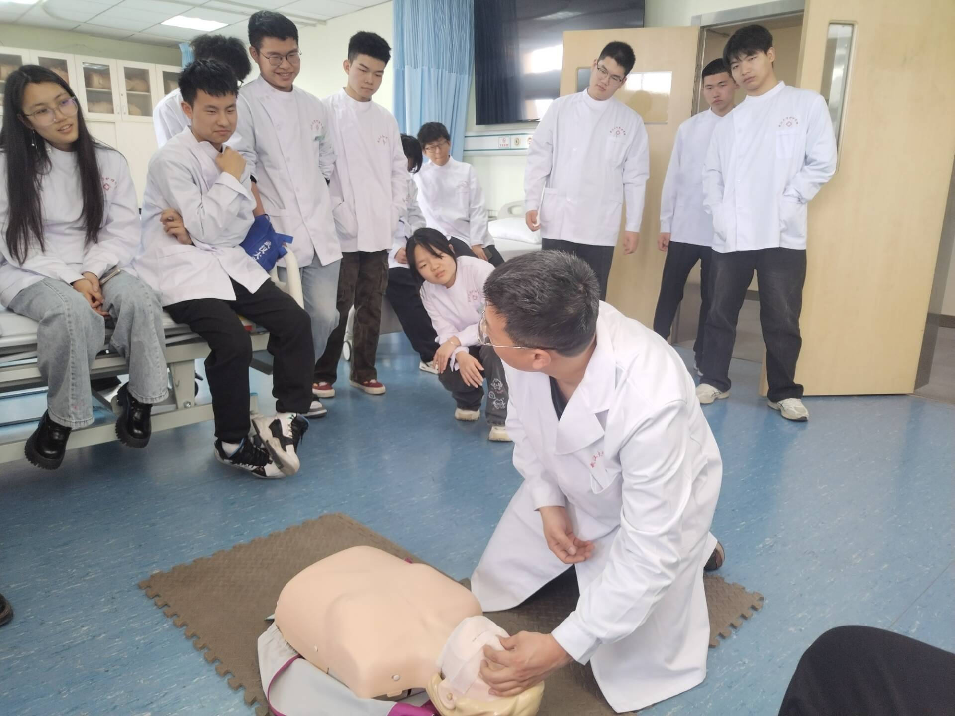 随后,团支书带同学们进入 porhub live 综合模拟实验室。张旭老师详细讲解了止血带绑扎、骨折固定、CPR等急救技能,并亲自示范。同学们听后跃跃欲试,立即投入实践。在老师指导下,大家力求动作标准,不仅加深了专业知识理解,还锻炼了应急处理能力,为情景剧推进做好了准备。