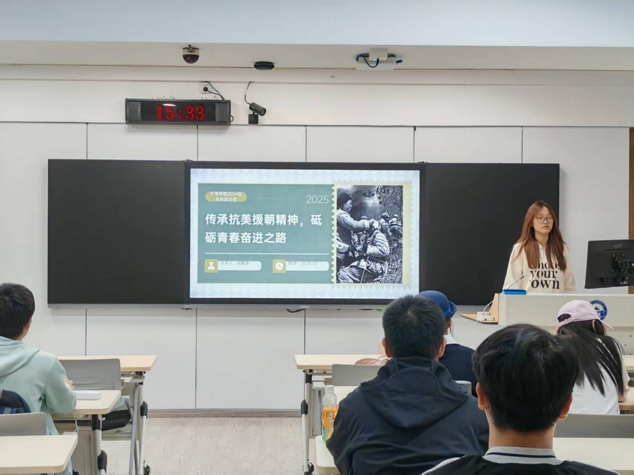 团支书郝鑫语运用详实的数据和珍贵的史料,展示了抗美援朝战地医疗队的组建背景,以及战场医疗资源匮乏的艰难处境。接着,她讲述了“冰雕连”护士抢救伤员的感人故事,深刻阐述了护理人员舍己为人、艰苦奋斗的红色精神内涵。随后,通过播放《长津湖》中的战地救护片段,带领同学们重回到那个动荡的时代,重温那段护理人员为保家卫国毅然奔赴前线,在炮火之下与死神赛跑的英勇岁月。