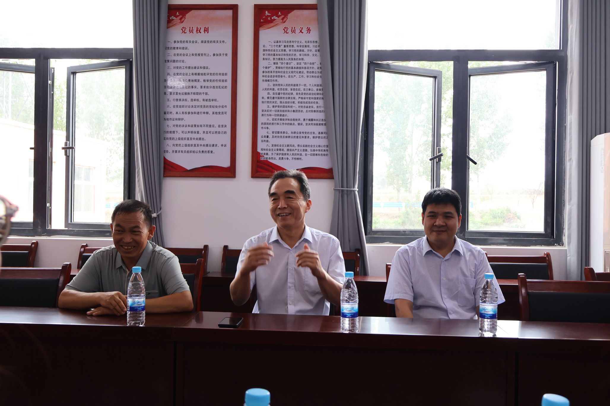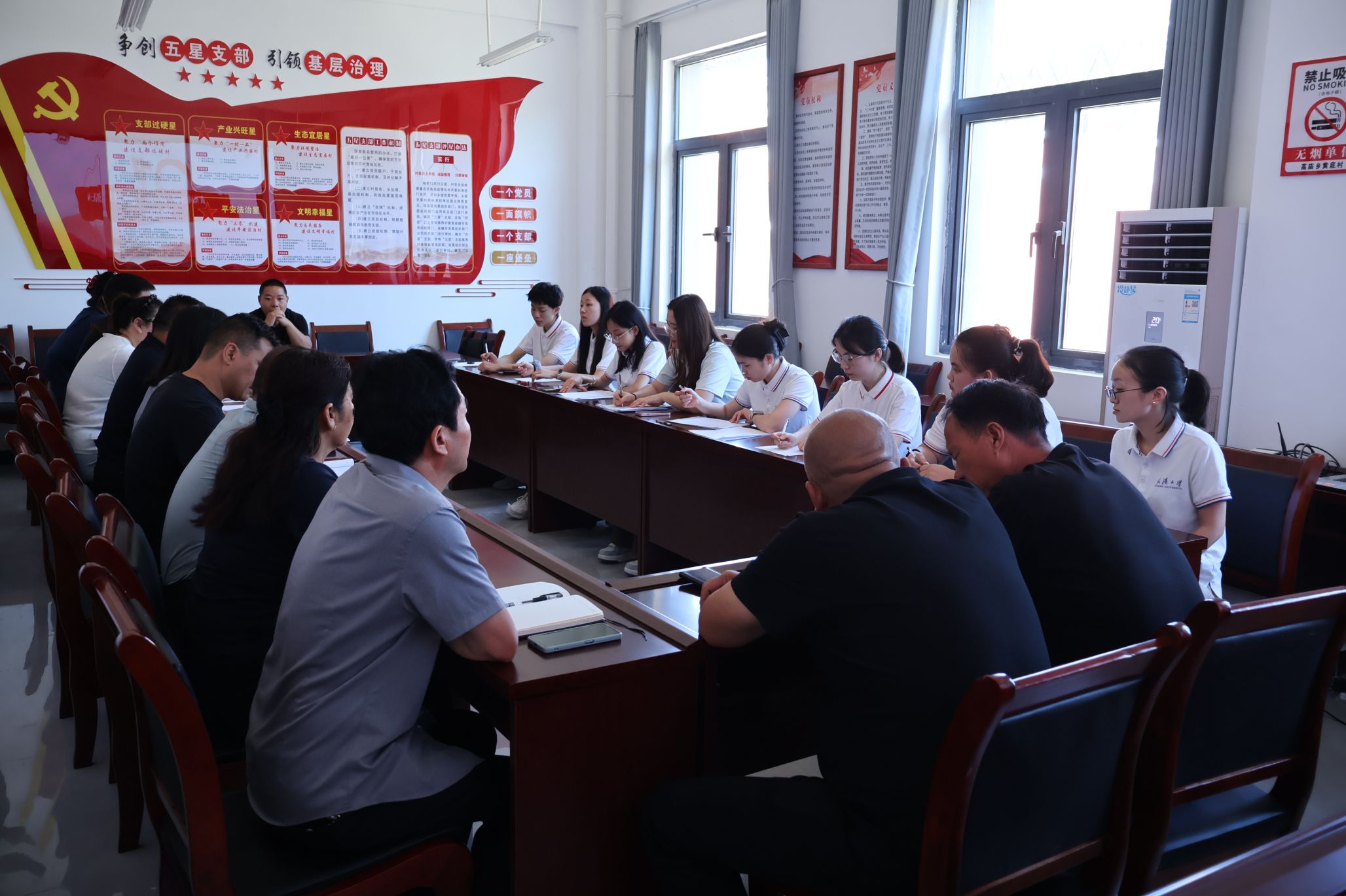 2024届校友、村党支部书记助理杜祎鑫介绍了村情及发展现状,实践队负责人张晓吉汇报了活动安排,驻村第一书记朱巧梅表示将全力支持,期待借高校力量破解乡村健康服务难题,实践队指导老师毛诗柔代表实践队赠送纪念品。活动开展期间,三门峡市卫生健康委党组书记、主任张建军,党组成员、副主任于双田专程到村看望慰问实践队师生,对同学们深入基层、服务乡村的行动表示肯定,并鼓励他们将所学知识与基层实践紧密结合,未来积极投身国家基层医疗卫生事业。