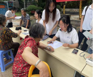 623日早上9,在得到提前联系的社区物业人员的帮忙下,工作很快就开始正式展开。实践队的伙伴们早早来到了活动现场热情高涨,积极布置场地、分发材料并广泛宣传,前来免费测量血压及咨询的路人络绎不绝。在短短的一个小时内,测量血压的中老年社区居民就有几十人,队员们耐心地给爷爷奶奶进行饮食、运动指导,了解老年人对老化的态度,讲授认知症基本知识