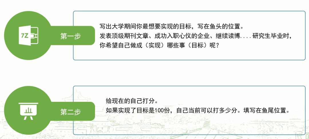 用鱼骨图的方式帮助你将“理想愿景”变为更加具体成目标,将大目标分解成一个个小目标和行动步骤,从而更有针对性和阶段性地开展行动。