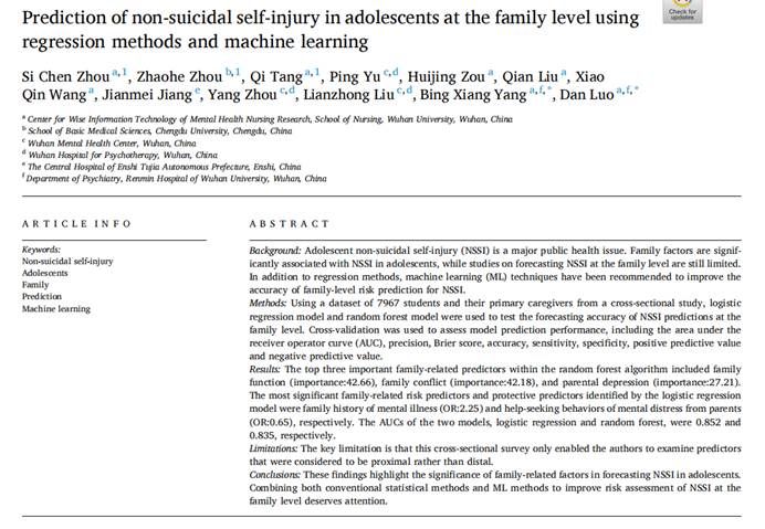近来, porhub live 杨冰香课题组在《Journal of Affective Disorders(中科院二区TOPJCR一区;IF=6.533)期刊上发表了从家庭层面探索青少年非自杀性自伤风险预测因素的最新研究成果(见图1)。论文题目为“Prediction of non-suicidal self-injury in adolescents at the family level using regression methods and machine learning”。 porhub live 为该论文第一作者和通讯作者单位,其中 porhub live 2021级硕士研究生周思辰、2020级本科生汤琦,成都大学基础医学院周兆河老师为共同第一作者, porhub live 罗丹老师、杨冰香副教授为共同通讯作者。