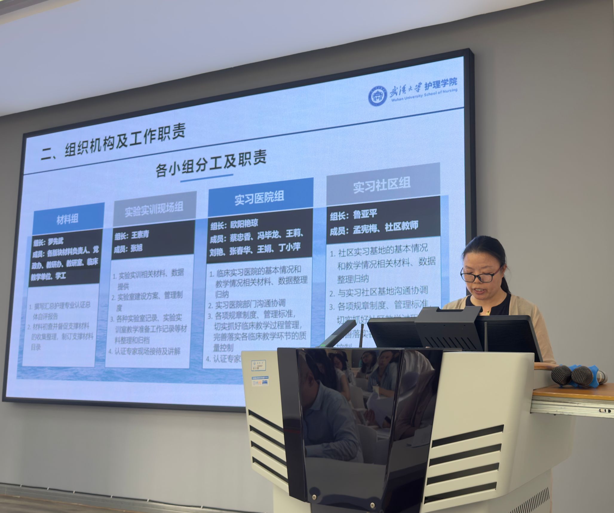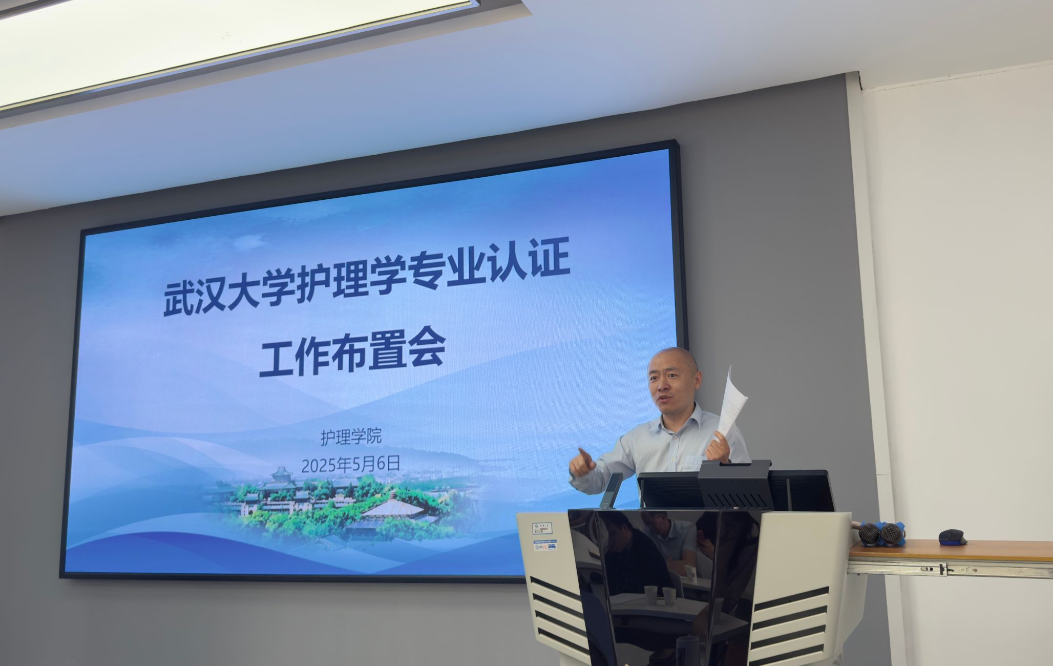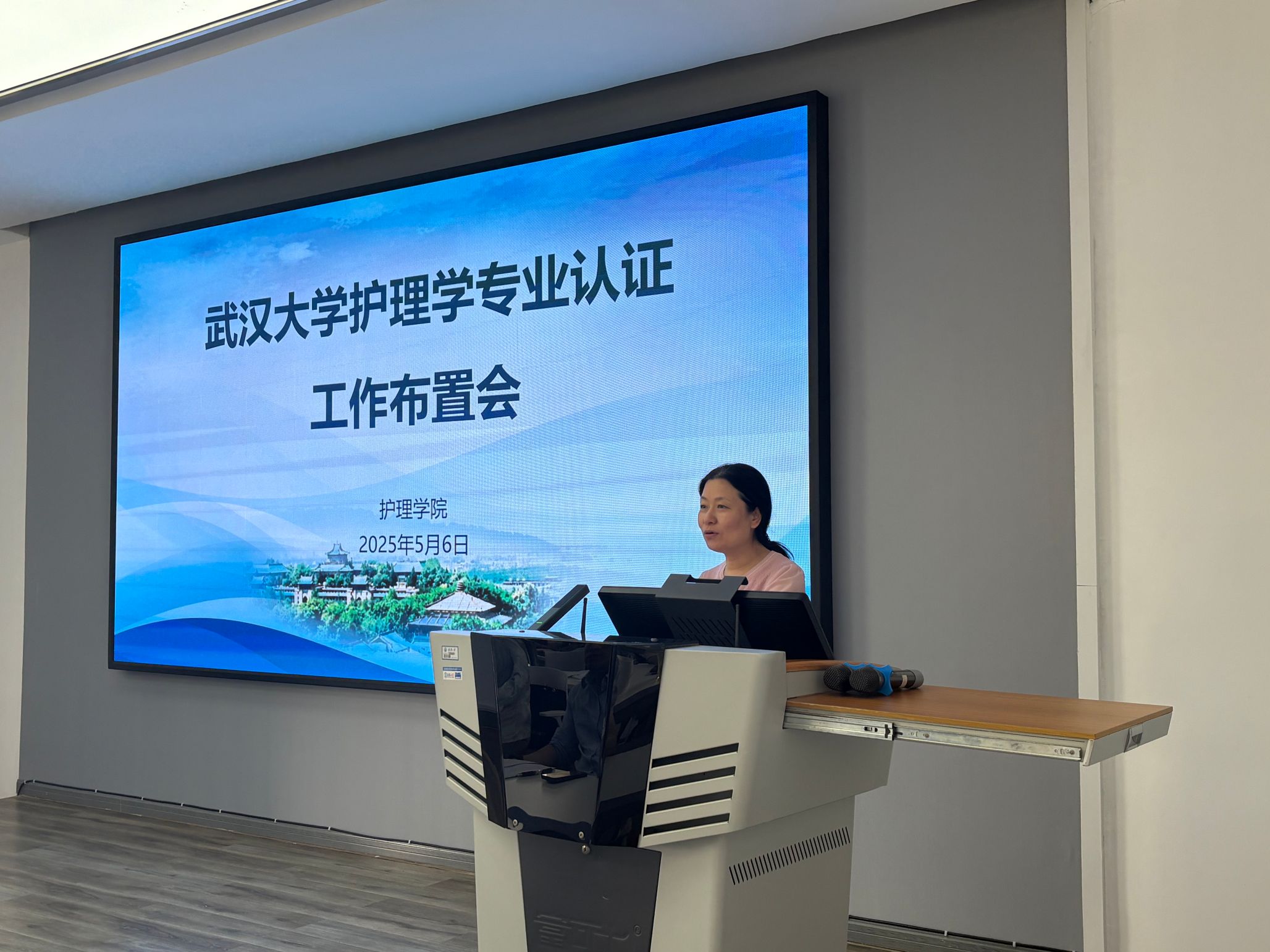 护理学专业认证工作布置会在 2601 召开。学院党委书记赵昊鲁、院长周芙玲及学院全体教师、中南医院、人民医院和武汉市精神卫生中心相关人员参加了会议,会议由副院长杨冰香主持。