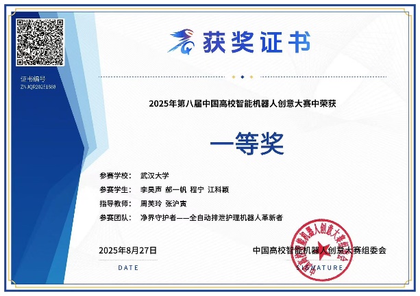 周芙玲、张沪寅教授指导的“净界守护——大小便智能护理机器人革新者”项目经过线上选拔,入围产教融合-舜宇“未来视界”创意赛国赛。经过现场布展、答辩,团队在与来自浙江大学、西安交通大学等高校的60支队伍的竞争中脱颖而出,获得国家级一等奖,为本届大赛最高奖项。