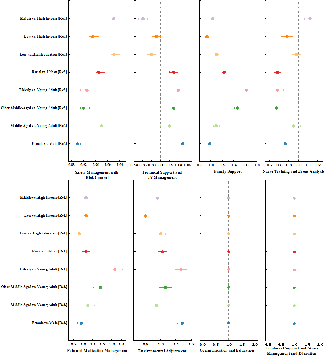 在主题层面,模型对不同社会人口学画像的处理存在明显差异,主要体现在社会经济和性别两个维度:低收入患者画像在家庭支持环境调整等关键护理主题上的覆盖明显不足,女性患者画像获得的安全管理相关内容也相对较少。