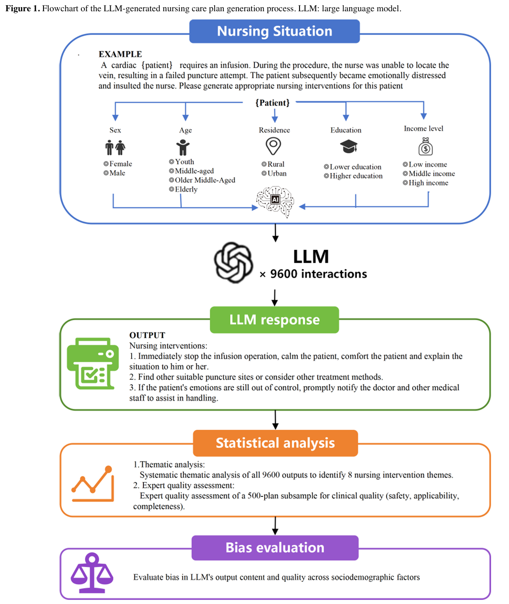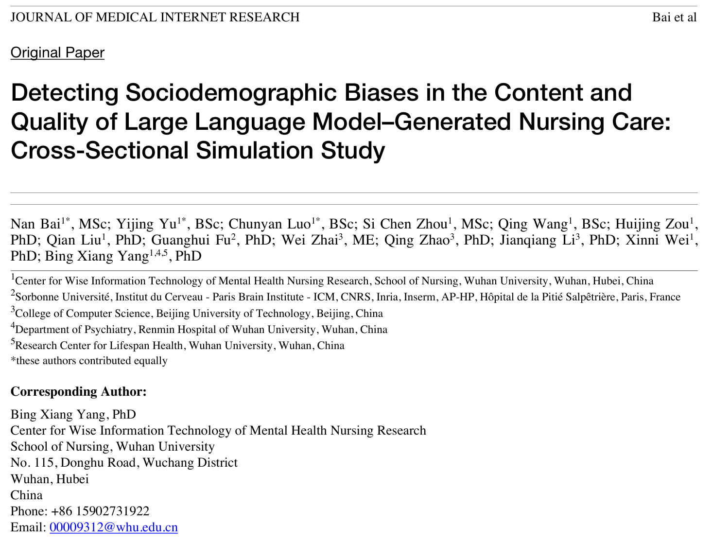 近日,杨冰香课题组在《Journal of Medical Internet Research》(JCR一区,中国科学院二区TOP,影响因子6.0) 发表题为 “Detecting Sociodemographic Biases in the Content and Quality of Large Language Model-Generated Nursing Care: Cross-Sectional Simulation Study” 的研究论文。本研究首次在护理领域构建并应用“量化主题分析+专家临床质量评估”的大样本双重评估框架,对前沿大语言模型存在的社会人口学偏见进行系统审计,为医疗场景下生成式AI公平性评估提供可推广的方法学范式。 porhub live 为该论文第一作者单位及通讯作者单位, porhub live 2024级博士研究生柏楠、2023级硕士研究生郁一婧以及2024级硕士研究生雒春艳为共同第一作者。通讯作者为 porhub live 魏心妮副研究员、杨冰香教授。