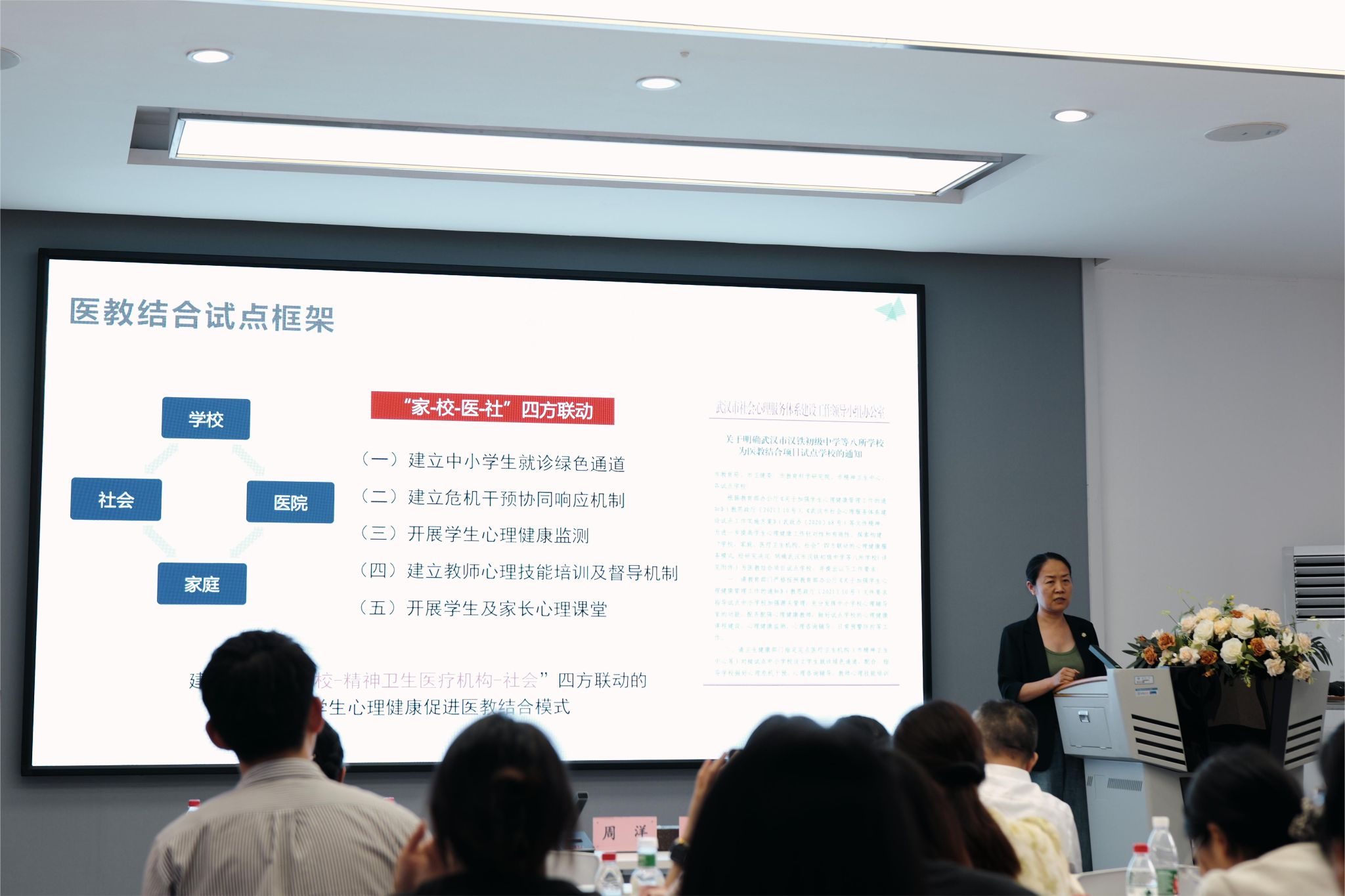 赵俊书记以“武汉市医教结合项目经验分享”为主题,从政策背景、项目进展、区级模式、下一步计划等四个方面分享了青少年心理健康促进工作的工作路径与实践经验。她介绍到,在市教育局,市卫健委的大力领导和支持下,武汉市医教结合试点工作于2020年正式启动。该项目组建立了“家庭-学校-精神卫生医疗机构-社会”四方联动的中小学生心理健康促进医教结合模式,探索了从阶梯式筛查、评估到诊断和分级分类干预的中学生心理健康促进工作路径,完善了转介与家校医协作互通机制。她表示,未来将试点四区八校“扩面提质”,开展停学青少年家庭成长训练营,探索全区医教结合服务模式,助力武汉市中小学生心理健康维护服务(图7)。