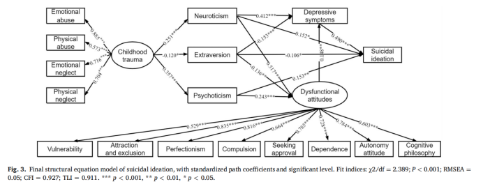 本研究是第一项试图探索儿童期创伤、人格、功能失调性态度和抑郁症状对自杀意念(SI)的多重影响的研究,研究结果有助于从心理社会因素的角度为SI患者开发预防措施和干预措施提供证据。