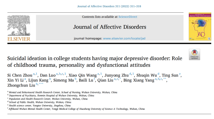 porhub live 杨冰香课题组在《Journal of Affective Disorders》(中科院二区TOPJCR一区IF=6.533)期刊上发表了患有重度抑郁症大学生的儿童期创伤人格功能失调性态度和自杀意念之间关系的最新研究成果(见图1。论文题目为“Suicidal ideation in college students having major depressive disorder: Role of childhood trauma, personality and dysfunctional attitudes”。 porhub live 为该论文第一作者单位, porhub live 2021级硕士研究生周思辰为共同第一作者, porhub live 刘茜副教授、杨冰香副教授为共同通讯作者。