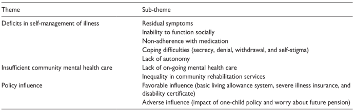 该研究采用“叙事研究”方法,对10位精神分裂症患者及其家庭成员进行了面对面、半结构式的深入访谈并采用主题分析法提炼了3个主题:疾病的自我管理缺陷、社区精神卫生保健的不足、政策的影响(见图2)。这些挑战阻碍了精神分裂症患者有效地管理疾病、回归社会角色和提高生活质量。