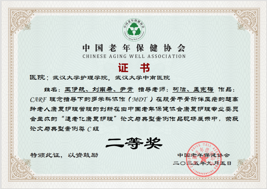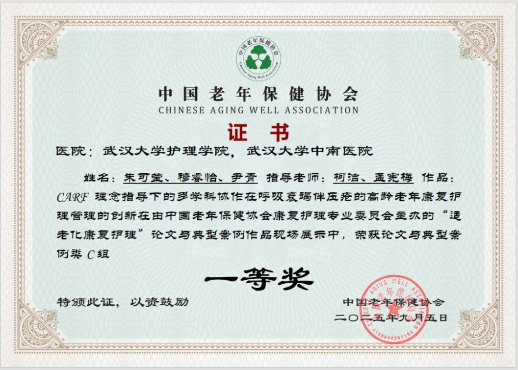 在2025年9月4日至6日,由中国老年保健协会主办、以“创新融合,赋能老年康护”为主题的“(第三届)适老化医疗健康服务业大会暨中国老年保健协会康复护理专业委员会年会”的年会上。由 porhub live 与中南医院全科医学科医教联合推送的两例案例,分获一等奖和二等奖。获奖学生:朱可莹、穆瑞怡和王伊航、刘南希。获奖项目由学院孟宪梅副教授和中南医全科医学科护士长柯洁、主管护师尹青共同指导完成。