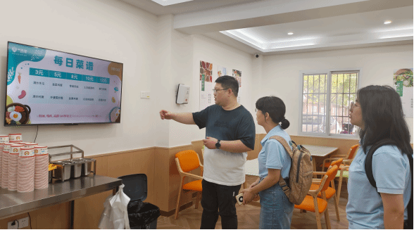 随后,同学们前往第二站——江汉里吉年颐悦中心。工作人员细心讲解到,江汉里吉年颐养中心利用信息化智能化技术记录老年人的信息、工作人员服务的时间和老年人需要的护理级别。同时,幸福食堂上设有中医保健中心,为周边老年人提供针灸、拔罐服务,提升老年人幸福感。