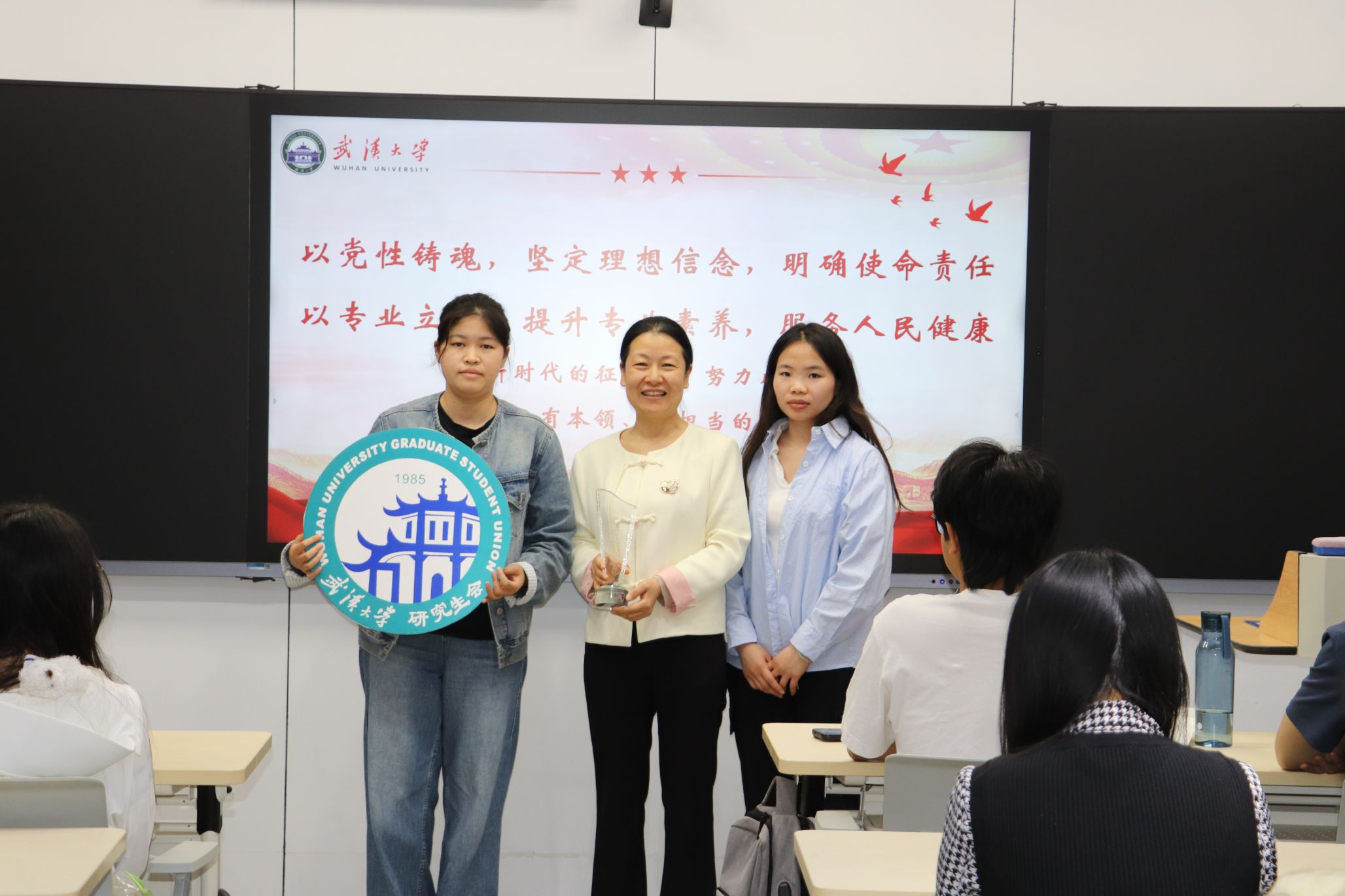 研究生会代表为周院长颁发弘毅讲堂奖杯,全体参会人员合影留念。