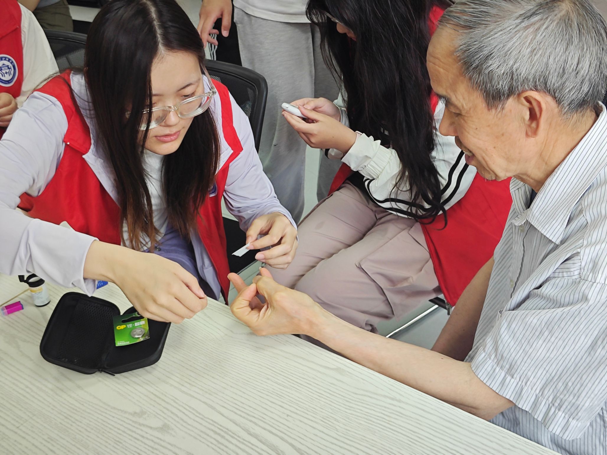 43日的首场活动在社区颐养中心举办,以“知识普及+行为引导”为核心。活动开始前,志愿者及工作人员提前到达现场,做好设备调试、引导签到和分组就坐等准备工作。暖场环节播放的糖尿病趣味科普视频迅速吸引了居民的注意力。随后,青年志愿者结合PPT,从糖尿病的分型、“三多一少”典型特点切入,通过案例图片详细讲述并发症风险,并围绕饮食、运动等方面讲解预防及自我管理知识,期间穿插互动提问,激发居民参与热情。健康互动环节,志愿者为居民免费测量血糖、血压,指导填写健康风险评估表并解读疾病风险;通过膳食模型开展“餐盘法”搭配挑战,纠正不当搭配。活动最后,华夏银行工作人员指导居民制作手工艾草锤,兼具趣味性与纪念意义。