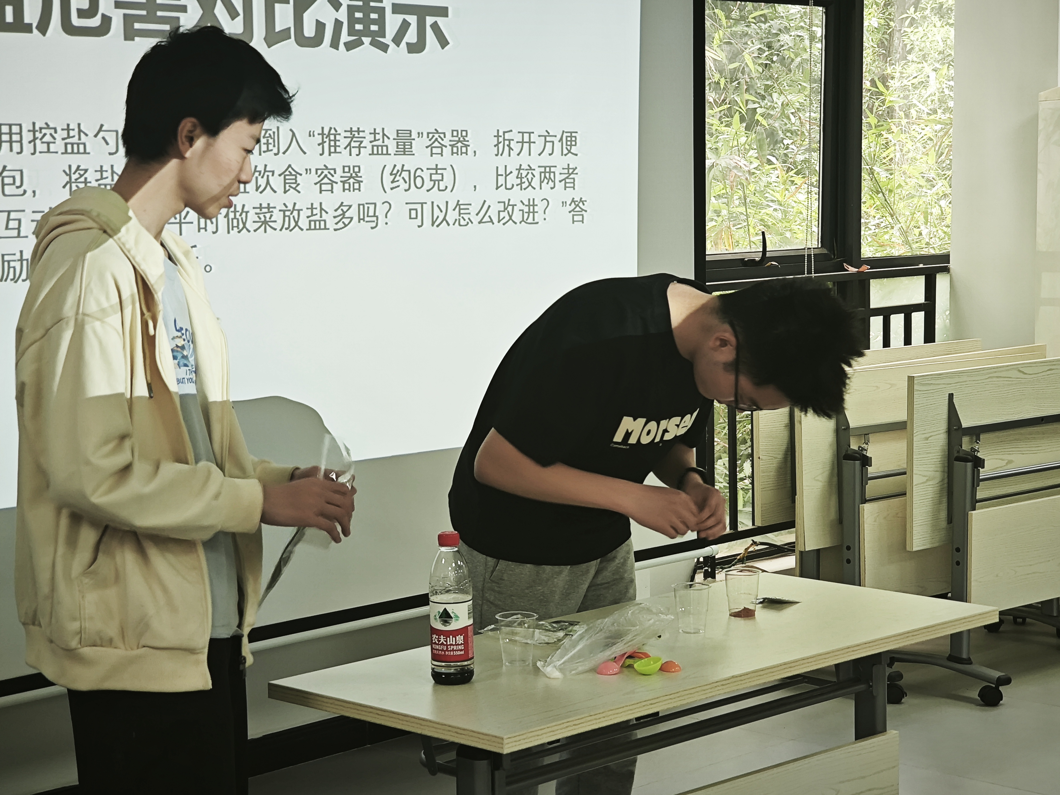 417日的第二场活动在社区二楼活动室开展,以“简单化、实用化”为原则。高盐危害对比演示中,志愿者用控盐勺量取推荐盐量和方便面调料包中的盐量进行对比,直观展示高盐饮食危害,并通过互动提问和奖励贴纸的方式引导居民思考改进方法。控盐技巧实操环节,主持人引导居民讨论少放盐的家常菜,志愿者演示“最后放盐”“用醋提味”等技巧,鼓励居民模仿并给予贴纸奖励。生活妙招分享环节,志愿者总结控盐技巧,邀请居民分享自家经验并赠送扇子。