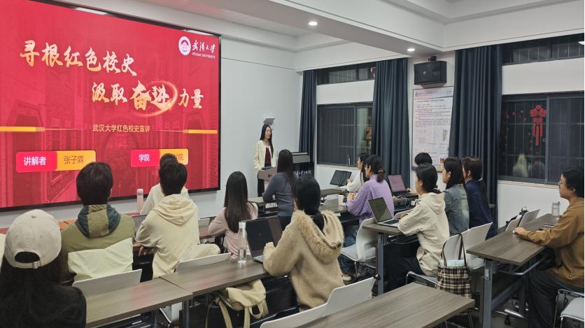 活动伊始,张子霖同志以《寻根红色校史,汲取奋进力量》为题开展宣讲。她紧扣“溯源自强、薪火相传、奋进新程”三大篇章,带领全体党员循着珞珈山的红色脉络,回溯学校从自强学堂救亡图存的萌芽觉醒,到烽火岁月里的坚守担当,再到新时代砥砺奋进的壮阔征程,激励全体党员以先辈为榜样,坚定理想信念,锤炼过硬作风,勇担时代使命,在红色传承中凝聚奋进力量,以实干担当书写新时代青年的青春答卷。