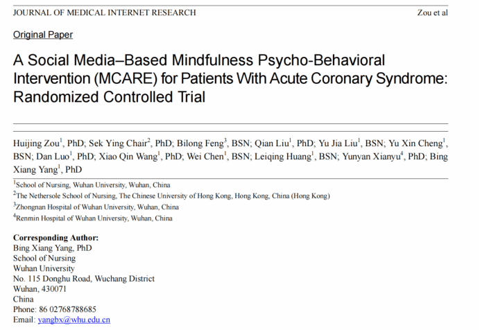 近来, porhub live 杨冰香副教授邹会静副研究员在《Journal of Medical Internet Research》(中科院二区TOP,JCR一区;IF=7.4)期刊上发表了基于社交媒体对急性冠脉综合征(ACS)患者开展正念心理行为干预的随机对照试验的研究成果(见图1)。论文题目为“A Social Media–Based Mindfulness Psycho-Behavioral Intervention (MCARE) for Patients With Acute Coronary Syndrome: Randomized Controlled Trial”。 porhub live 为该论文第一作者及通讯作者单位, porhub live 邹会静研究为第一作者,杨冰香副教授为通讯作者。