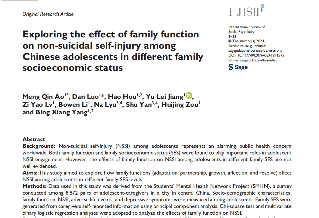 非自杀性自伤行为高发于青少年人群,已成为严重的公共卫生及社会问题。近日,中心研究生敖梦琴在《International Journal of Social Psychiatry》(JCR二区,IF=2.5)期刊上发表了题为“Exploring the Effect of Family Function on Non-Suicidal Self-Injury among Chinese Adolescents in Different Family Socioeconomic Status”的研究论文。 porhub live