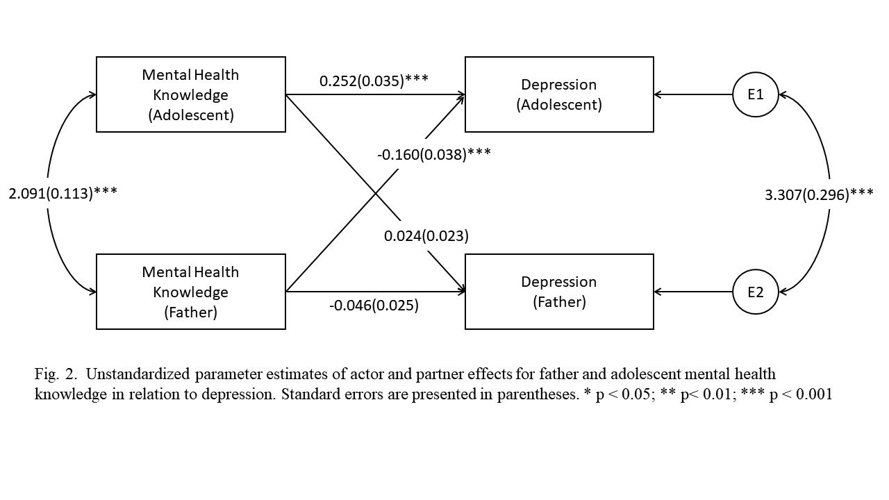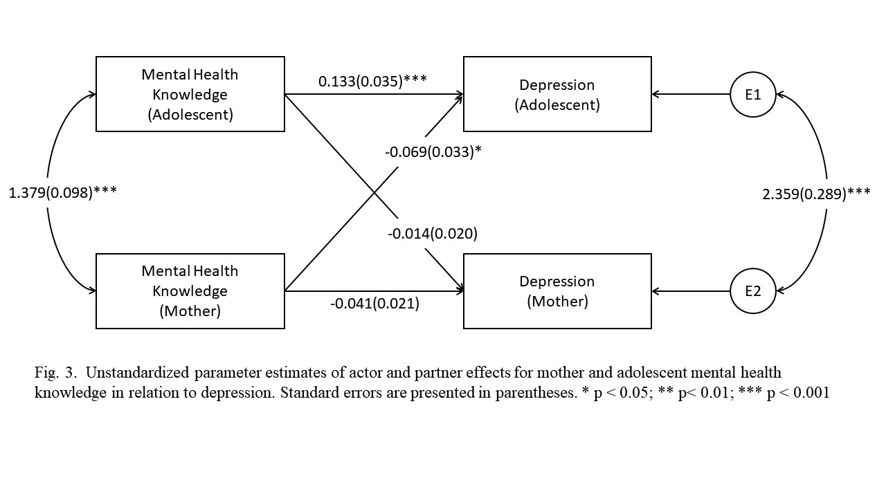 该研究通过对3,456名父亲-青少年和4,478名母亲-青少年成对样本进行调查,探索青少年及其父亲或母亲的心理健康知识对其自身和彼此抑郁的影响,以及父母的性别差异是否会造成对青少年抑郁的不同影响。该研究发现青少年的心理健康知识与其自身的抑郁症状呈正相关(主体效应),父母的心理健康知识与青少年抑郁症状负相关(客体效应),即父母心理健康知识较低时,青少年抑郁症状可能较为严重。
