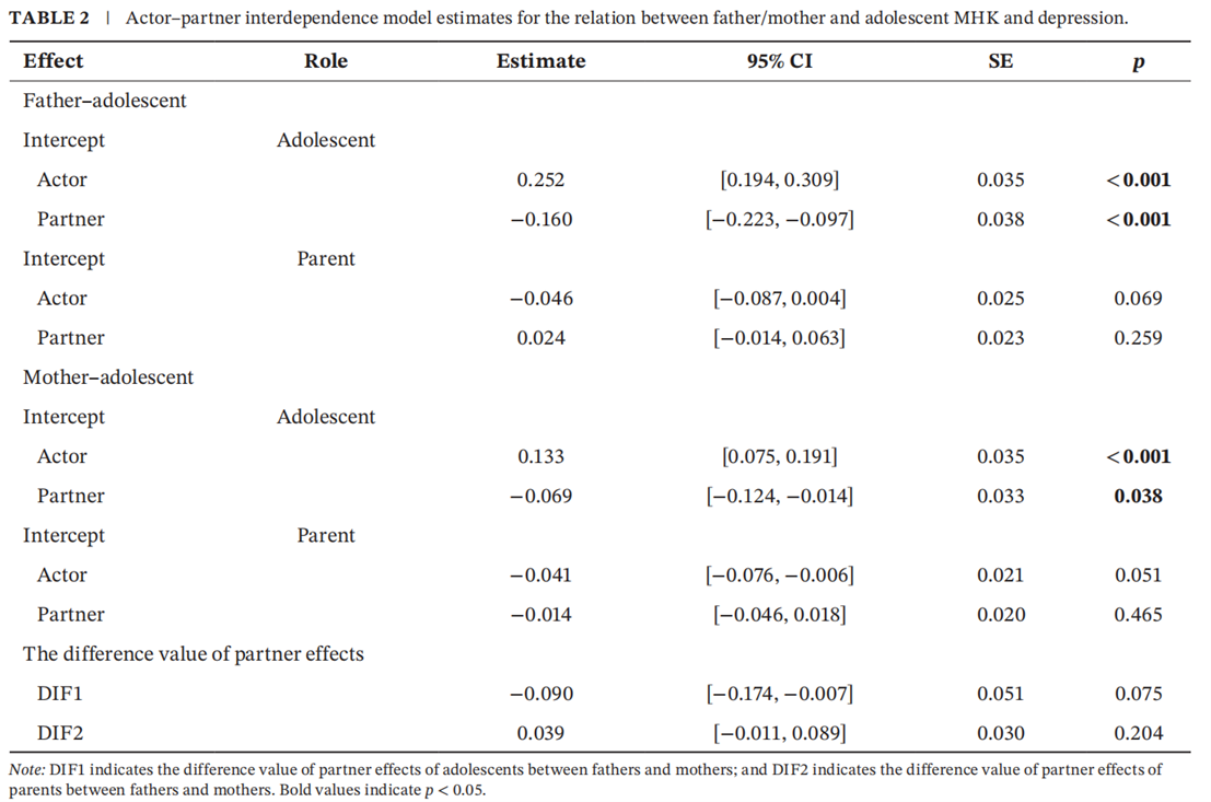 进一步分析发现,父母之间在客体效应上并无显著性别差异,父亲和母亲对青少年抑郁的影响之间的差异没有统计学意义。此外,研究还发现,青少年的抑郁与父母的抑郁症状存在显著关联,说明父母的心理健康状况对青少年的情绪和心理健康有着重要影响。本研究对以家庭为基础的心理健康护理干预具有指导意义,强调家庭中父母对青少年抑郁症状的重要影响。研究结果表明,应鼓励父母的参与,并应承认家庭在支持儿童心理健康方面的作用,从而有助于制定相关政策。