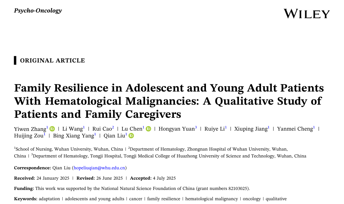 近日,中心研究生张艺文在国际期刊《》(JCR一区;中国科学院二区;IF=3.5)上发表了题为“Family Resilience in Adolescent and Young Adult Patients With Hematological Malignancies: A Qualitative Study of Patients and Family Caregivers”的研究论文。 porhub live