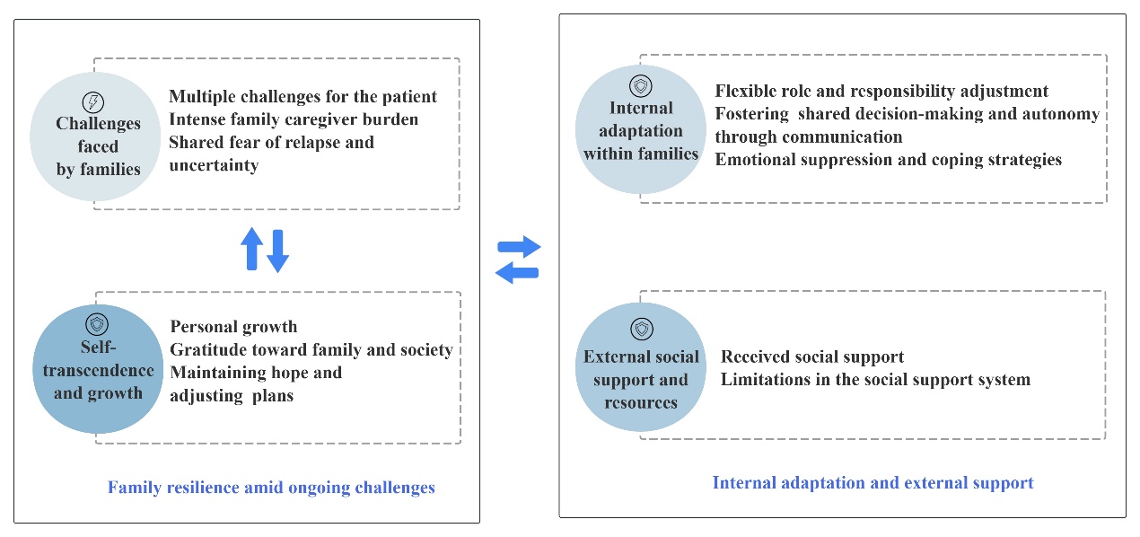 本研究总结了4个核心主题和11个子主题,揭示了年轻血液恶性肿瘤患者及其家庭照护者的家庭复原力动态过程。图1以可视化形式展示了该复原机制的主题结构与演变路径。确诊后,年轻血液恶性肿瘤家庭普遍面临患者身心痛苦、照护负担重及复发焦虑等多重挑战,激发家庭内部的复原性应对。家庭通过调整角色分工、促进沟通决策与发展个体化情绪调节策略,积极应对压力。家庭积极寻求外部社会支持,但在支持的获取途径和覆盖范围上仍存在一定限制。值得注意的是,许多家庭在整合内外部资源后实现积极转变,表现为个人成长、对家庭和社会的感恩,以及在不确定情境中保持希望并重新规划未来。该过程呈现出持续压力与复原力交织的动态循环,体现了家庭复原力的复杂性。