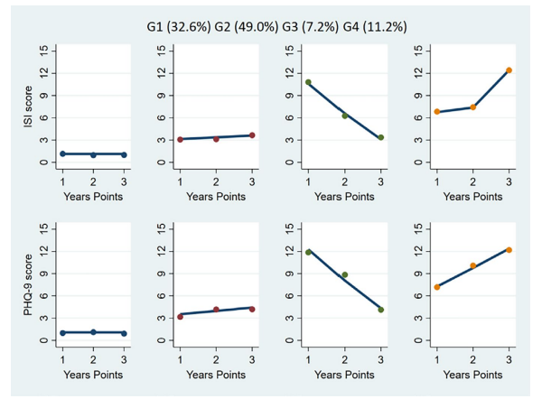 研究结果显示,青少年的抑郁-失眠症状轨迹可划分为四个具有明显特征的亚组:无症状组(在整个研究期间保持较低症状水平)、轻度症状组(持续存在轻度症状)、症状缓解组(初期症状较重但随时间逐渐缓解)以及症状增加组(症状随时间的推移而加重)。这一分类揭示了青少年心理健康发展的异质性特征。
