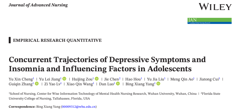近日,中心研究生程宇新在国际期刊《Journal of Advanced Nursing》(JCR一区;中国科学院二区;IF=3.4)上发表了题为“Concurrent Trajectories of Depressive Symptoms and Insomnia and Influencing Factors in Adolescents”的研究论文。中心2022级硕士研究生程宇新、江雨蕾和邹会静副教授是论文的共同第一作者,杨冰香教授为通讯作者。