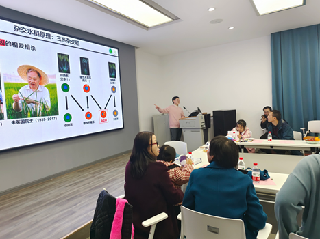在体验了“积极心理学视角”的幸福法后,胡骏教授团队成员刘柯嘉向大家介绍了杂交水稻的发展史、目前的成果、杂交水稻培育的基本原理以及发展趋势。